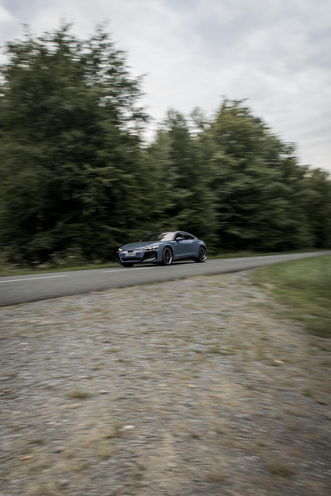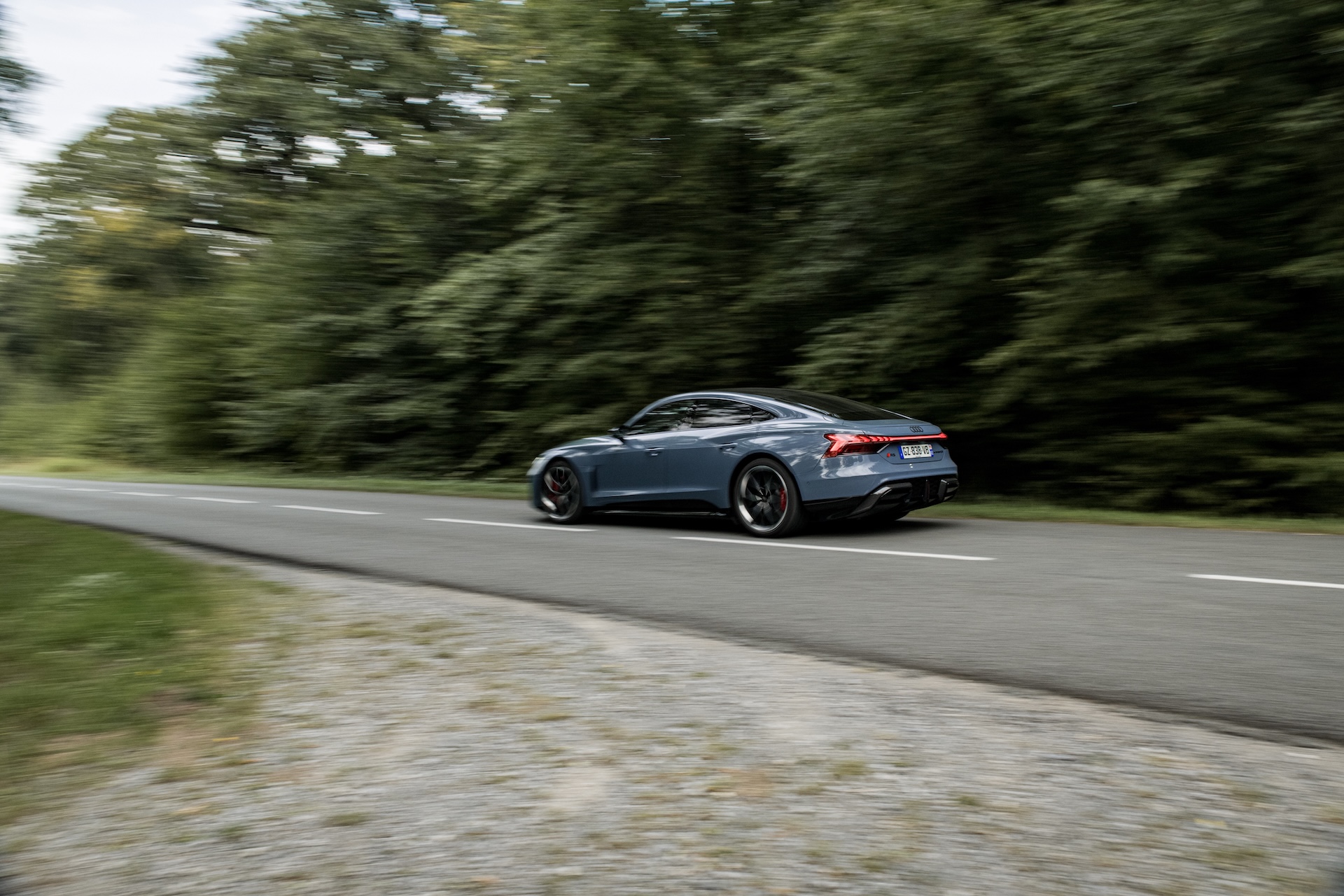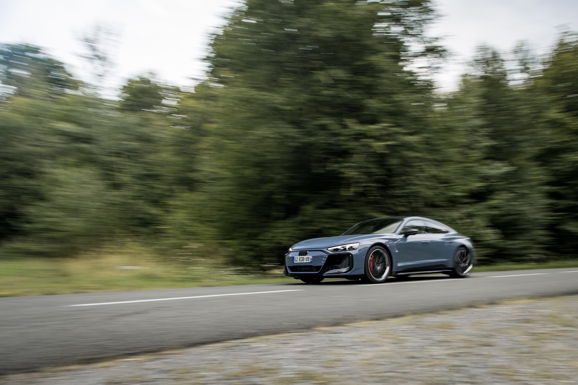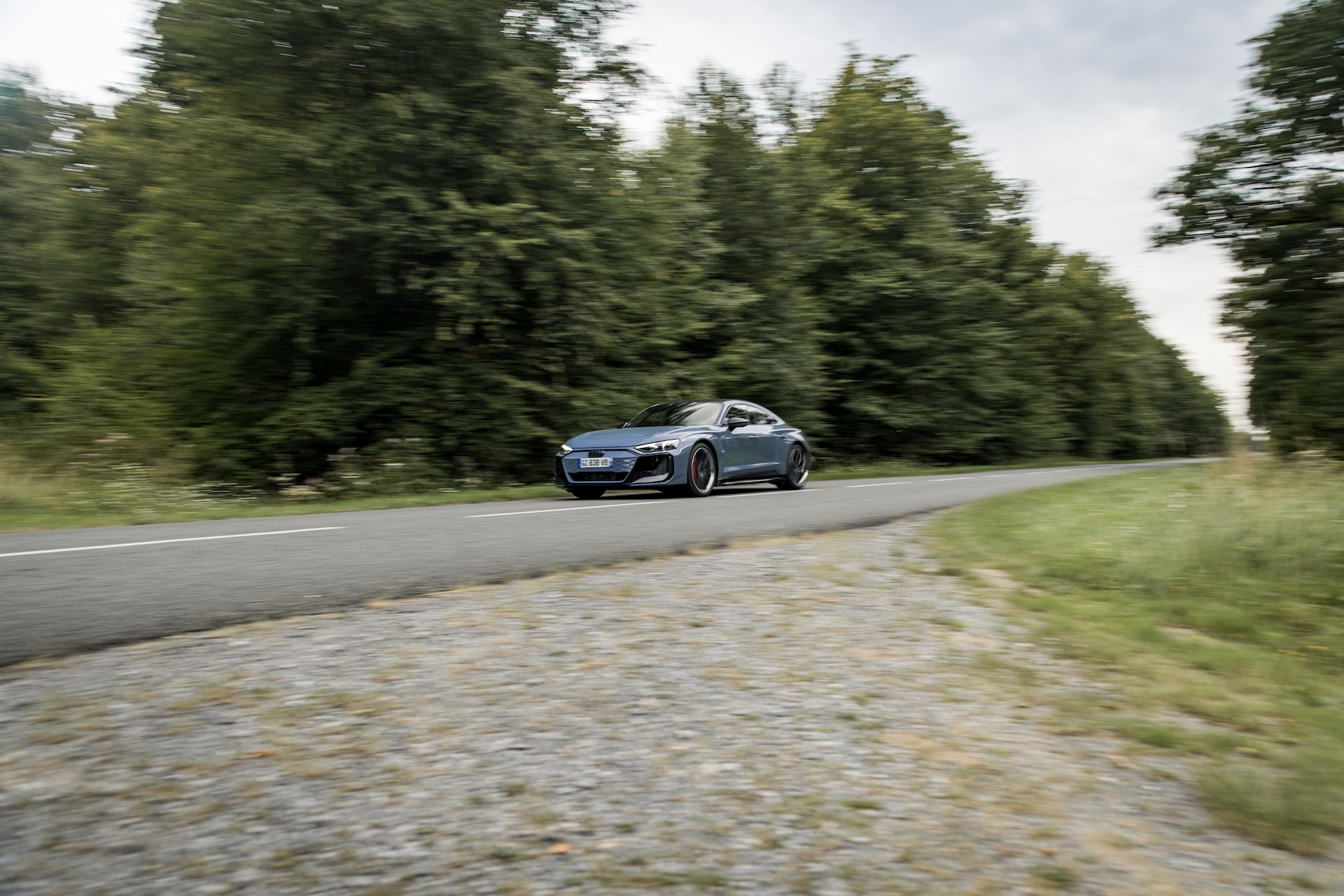 Quand on prend la route, l’enchantement continue. L’Audi RS e-tron GT n’est pas simplement une voiture électrique performante. C’est une chorégraphie mécanique et électronique où tout est réglé au millimètre. Le poids, pourtant massif, se dissout dans le comportement routier. Les premiers virages surprennent : on s’attend à une résistance, à devoir composer avec l’inertie. Mais non. On vire comme dans un coupé allégé. La direction est d’une précision chirurgicale, le châssis suit avec une neutralité impressionnante, et la motricité semble infinie.