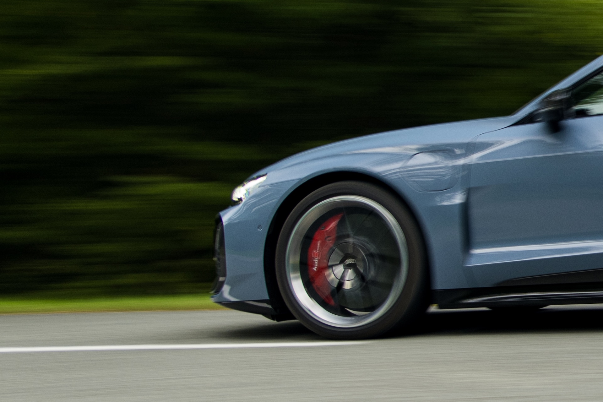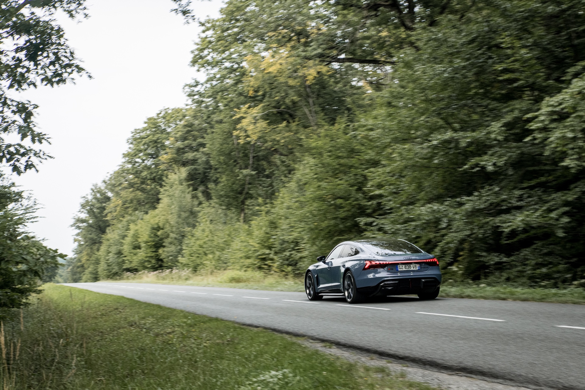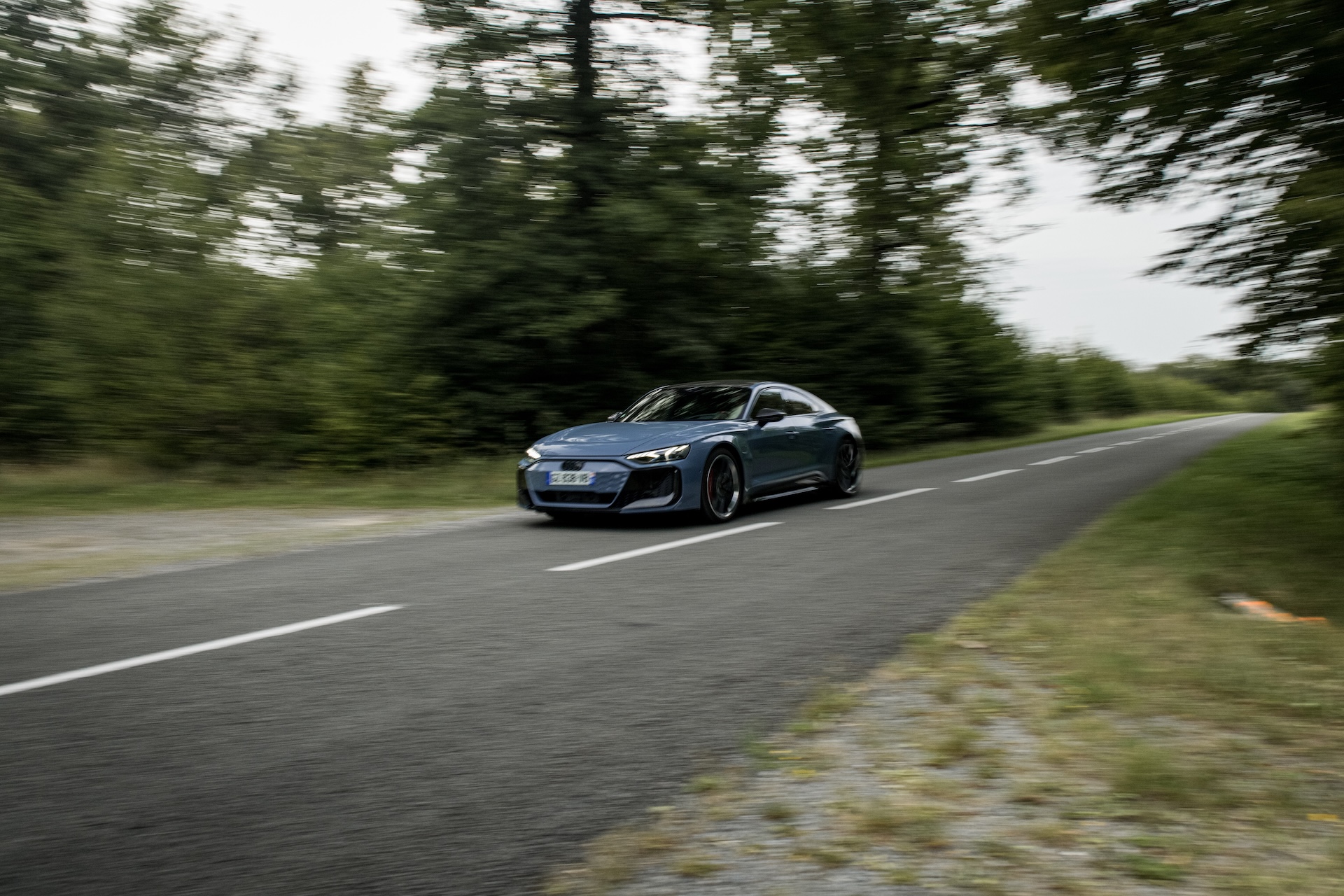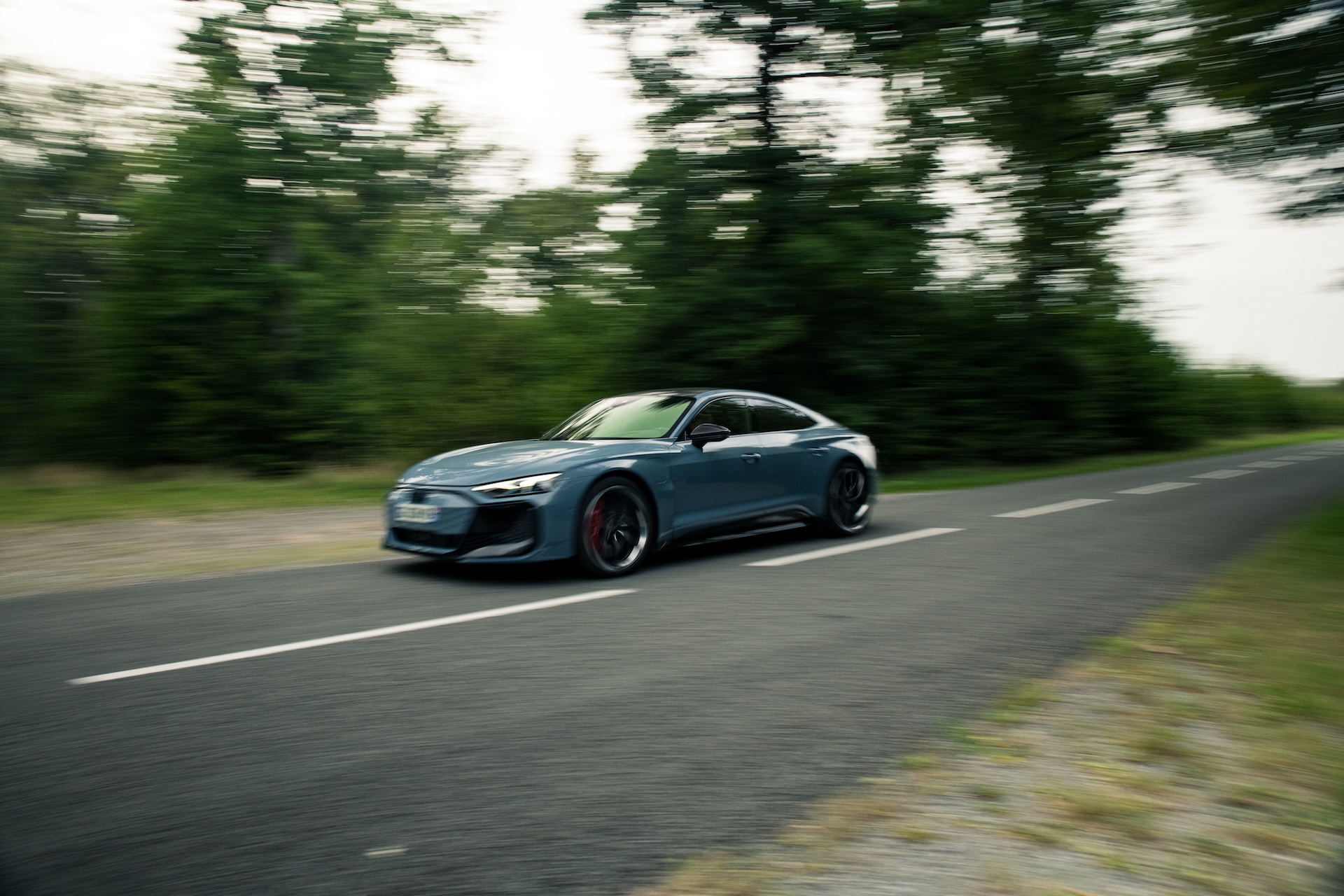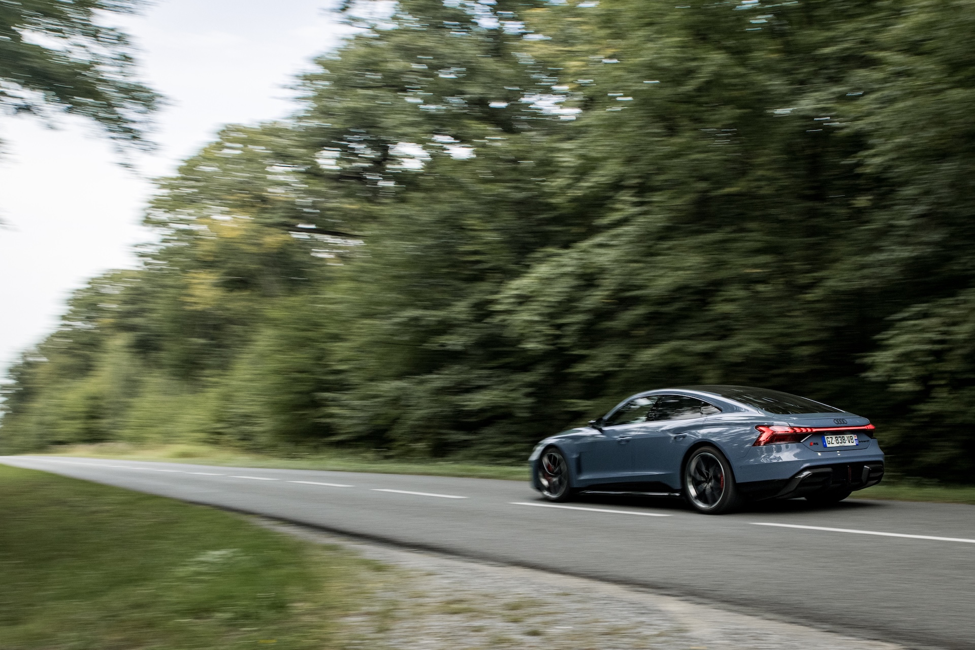 Quand on prend la route, l’enchantement continue. L’Audi RS e-tron GT n’est pas simplement une voiture électrique performante. C’est une chorégraphie mécanique et électronique où tout est réglé au millimètre. Le poids, pourtant massif, se dissout dans le comportement routier. Les premiers virages surprennent : on s’attend à une résistance, à devoir composer avec l’inertie. Mais non. On vire comme dans un coupé allégé. La direction est d’une précision chirurgicale, le châssis suit avec une neutralité impressionnante, et la motricité semble infinie.