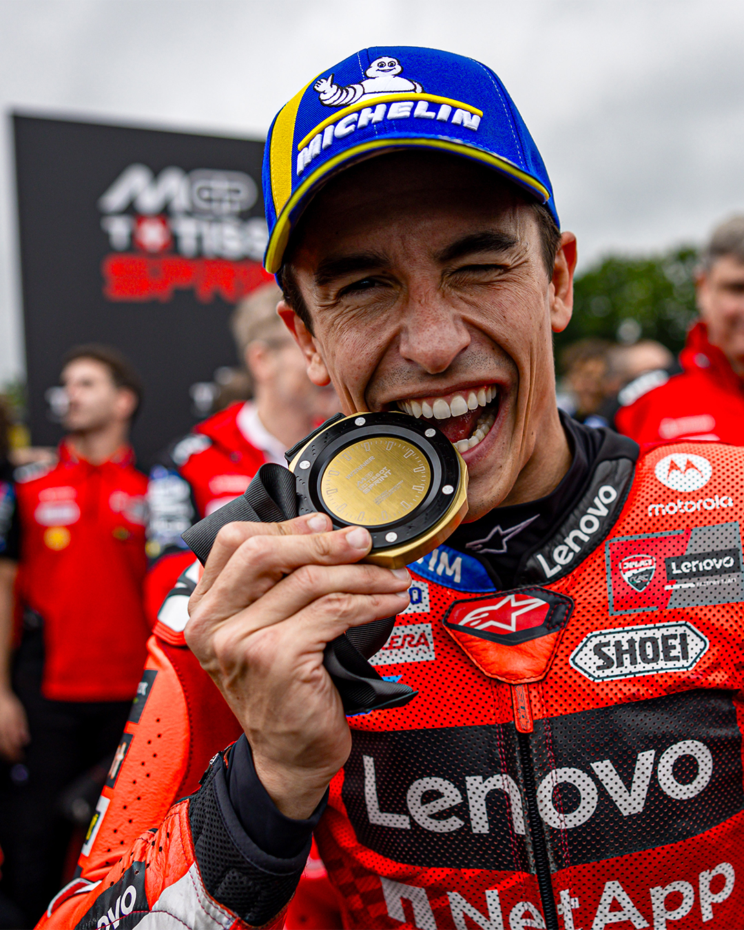« L’histoire continue, et quelle histoire ! Quatre titres pilotes consécutifs, c’est la preuve que lorsque le talent, la compétence et la passion se rencontrent, la frontière entre possible et extraordinaire disparaît. Ce qui paraît simple en piste est le fruit d’un travail acharné : des mois de conception, des heures de simulation et d’analyses, des stratégies peaufinées dans le moindre détail. Avec Marc, l’harmonie avec la Desmosedici GP a été immédiate. Il a confirmé nos attentes dès la première course, et souvent même dépassé ce que nous imaginions. Voir Pecco gagner en même temps que nous célébrons ce titre est une image qui restera longtemps gravée. »