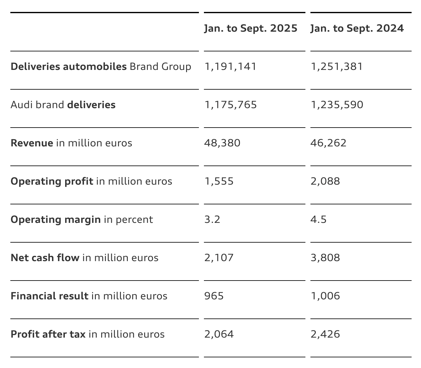 Le groupe Audi a publié des résultats en demi-teinte pour les neuf premiers mois de 2025, sur fond de ralentissement mondial et de restructuration interne. Si le chiffre d’affaires progresse de 4,6 % à 48,4 milliards d’euros, le bénéfice opérationnel recule à 1,6 milliard, contre plus de 2 milliards un an plus tôt. La marge d’exploitation tombe à 3,2 %, affectée par les droits de douane américains, des provisions CO₂ et le report du développement d’une plateforme électrique commune pour le segment D.