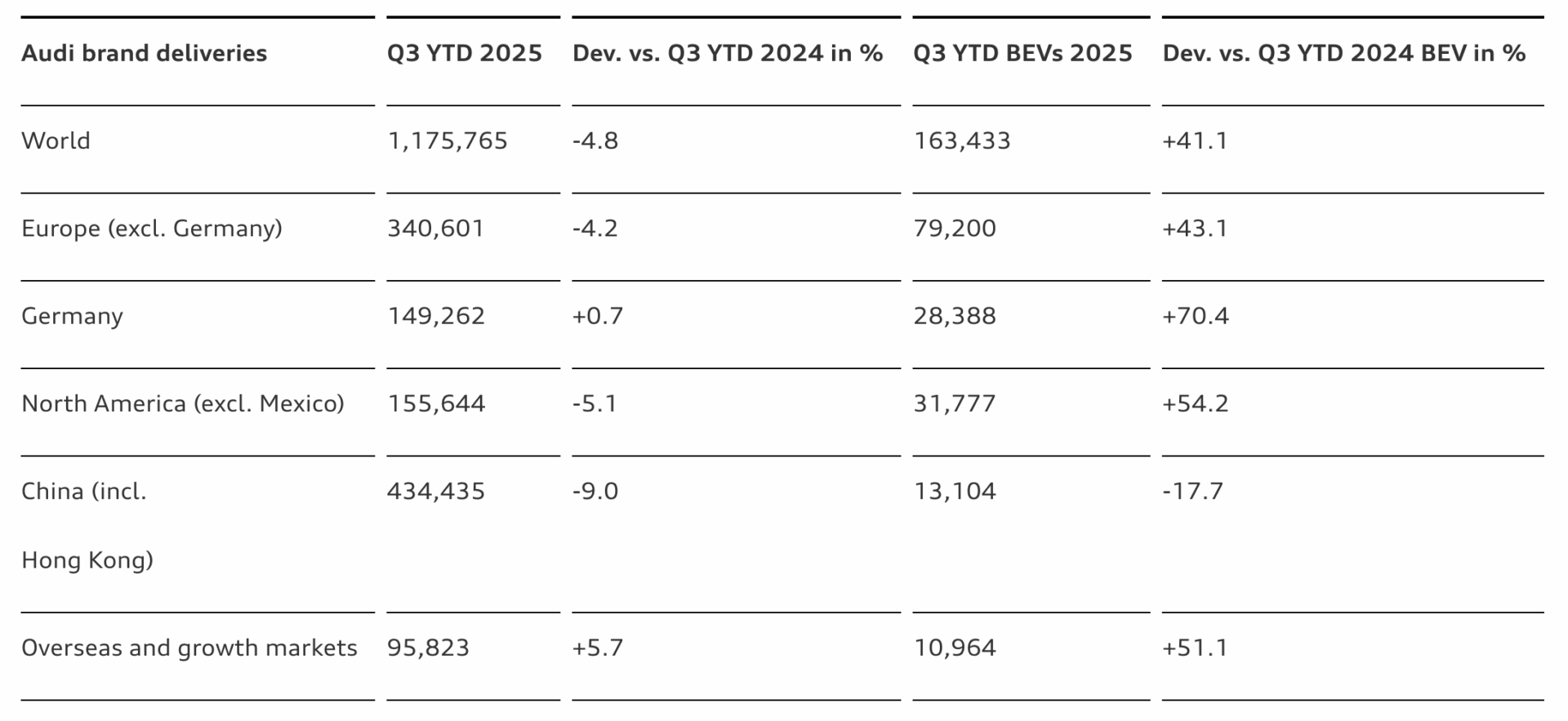 L’Allemagne, marché domestique du constructeur, tire particulièrement cette croissance. Les ventes de véhicules électriques y ont progressé de 70 %, tandis que les volumes globaux ont légèrement augmenté (+1 %). En Europe, Audi livre 341 000 véhicules (–4 %), dont 79 200 électriques (+43 %). En Amérique du Nord, la marque subit la pression tarifaire des États-Unis (–5 %), mais les ventes de BEV s’envolent (+54 %).