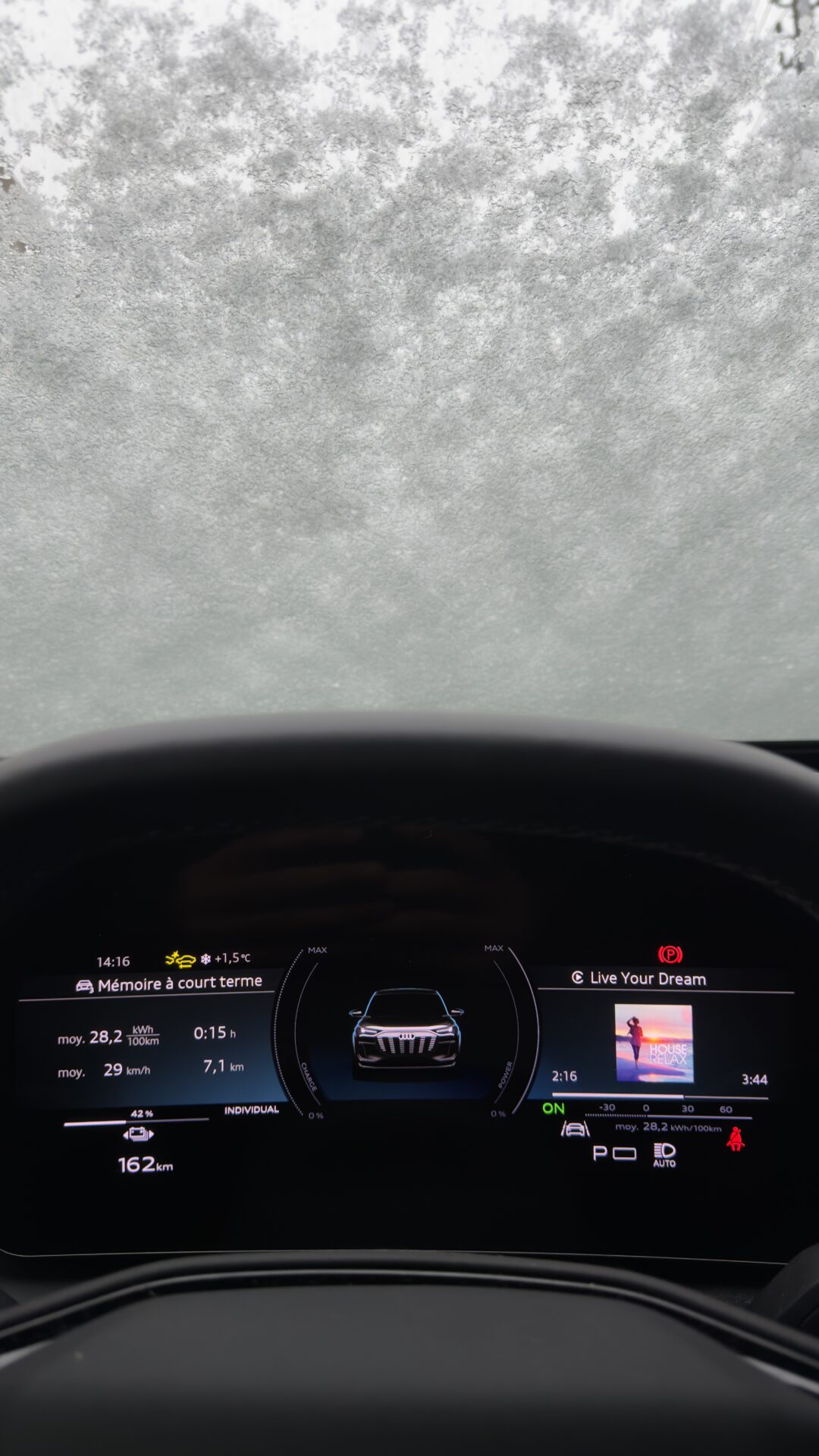 Ce chiffre mérite d’être analysé à froid (sans jeu de mots). Dans des conditions optimales, un véhicule électrique de cette taille pourrait descendre en dessous, mais ici, les valeurs relevées sont non seulement cohérentes, mais aussi révélatrices d’une maturité technologique certaine. Le froid reste l’ennemi numéro un des batteries : il réduit leur efficacité, exige davantage d’énergie pour le chauffage de l’habitacle et impose une gestion plus lourde pour maintenir la batterie dans sa plage de fonctionnement optimale. Malgré cela, l’Audi Q6 Sportback e-tron quattro a réussi à maintenir une consommation très contenue au regard de sa masse, de sa puissance et des conditions rencontrées.