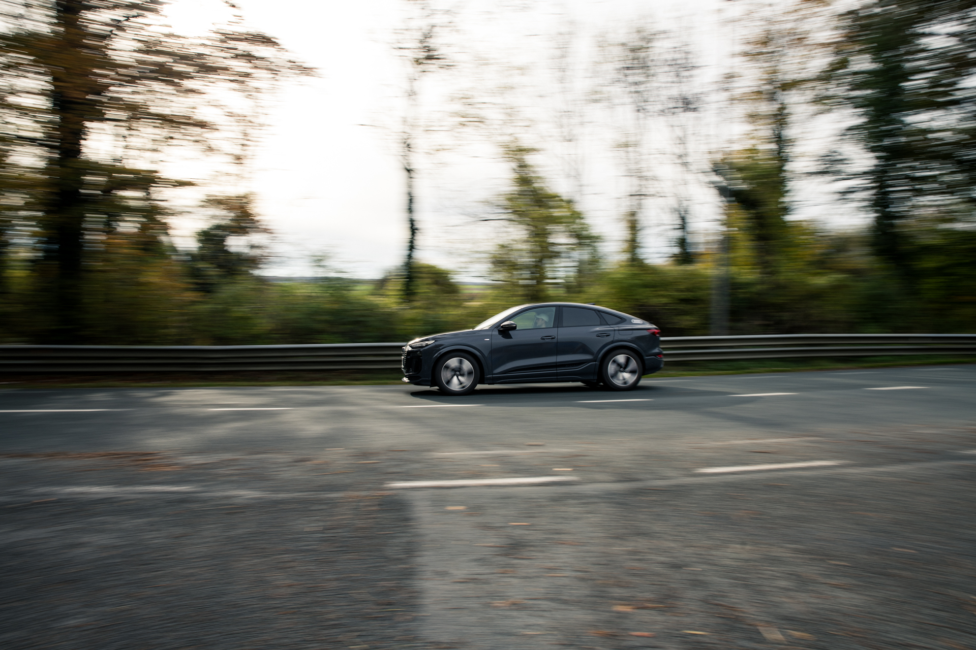 La face avant reste fidèle à la signature e-tron : calandre Singleframe pleine, optiques acérées, regard numérique et précis. Mais la magie opère surtout quand on passe sur le profil. Là, la ligne plonge. L’arrière se resserre. Le pavillon file vers le becquet avec une élégance rare pour un SUV électrique.
