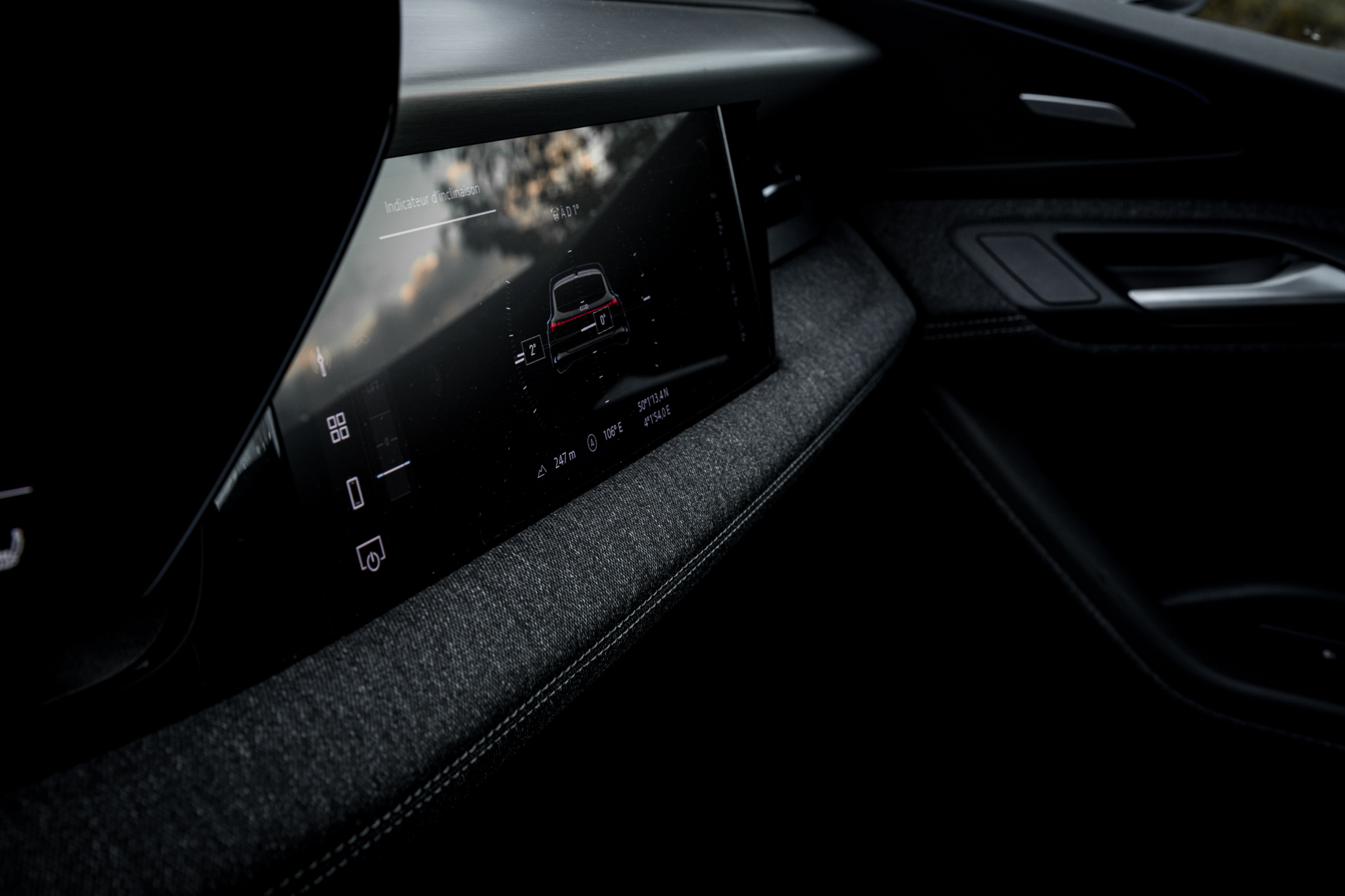 La qualité du tissu choisi pour cette version performance mérite d’être soulignée. Dans un univers premium souvent saturé de cuir, Audi ose un textile haut de gamme, dense, agréable au toucher. Ce choix apporte une chaleur inattendue à l’habitacle, un vrai confort visuel et tactile.