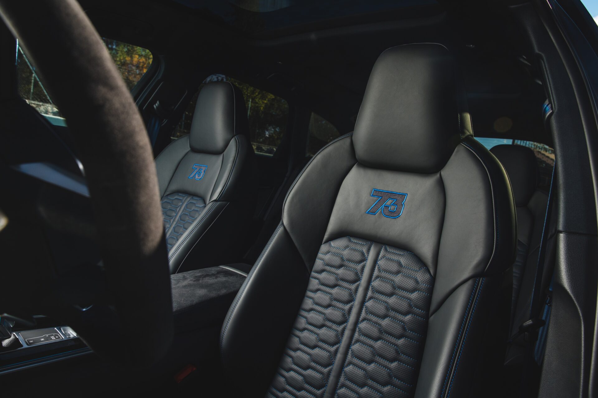 L’intérieur traduit encore mieux cette exclusivité. Les seuils de portes illuminés affichent “AUDI SPORT X MM 93” et “AUDI SPORT X AM 73”, un marquage créé spécialement pour eux. Les sièges abandonnent le logo RS au profit des numéros iconiques des frères Márquez, brodés en rouge pour Marc, en bleu pour Álex. Les ceintures, surpiqûres et éléments décoratifs reprennent ce même code couleur, créant une ambiance sportive et intime, taillée comme un hommage personnalisé à leurs carrières. Ce niveau-là de personnalisation sort directement de l’usine, un événement rare pour Audi Espagne.