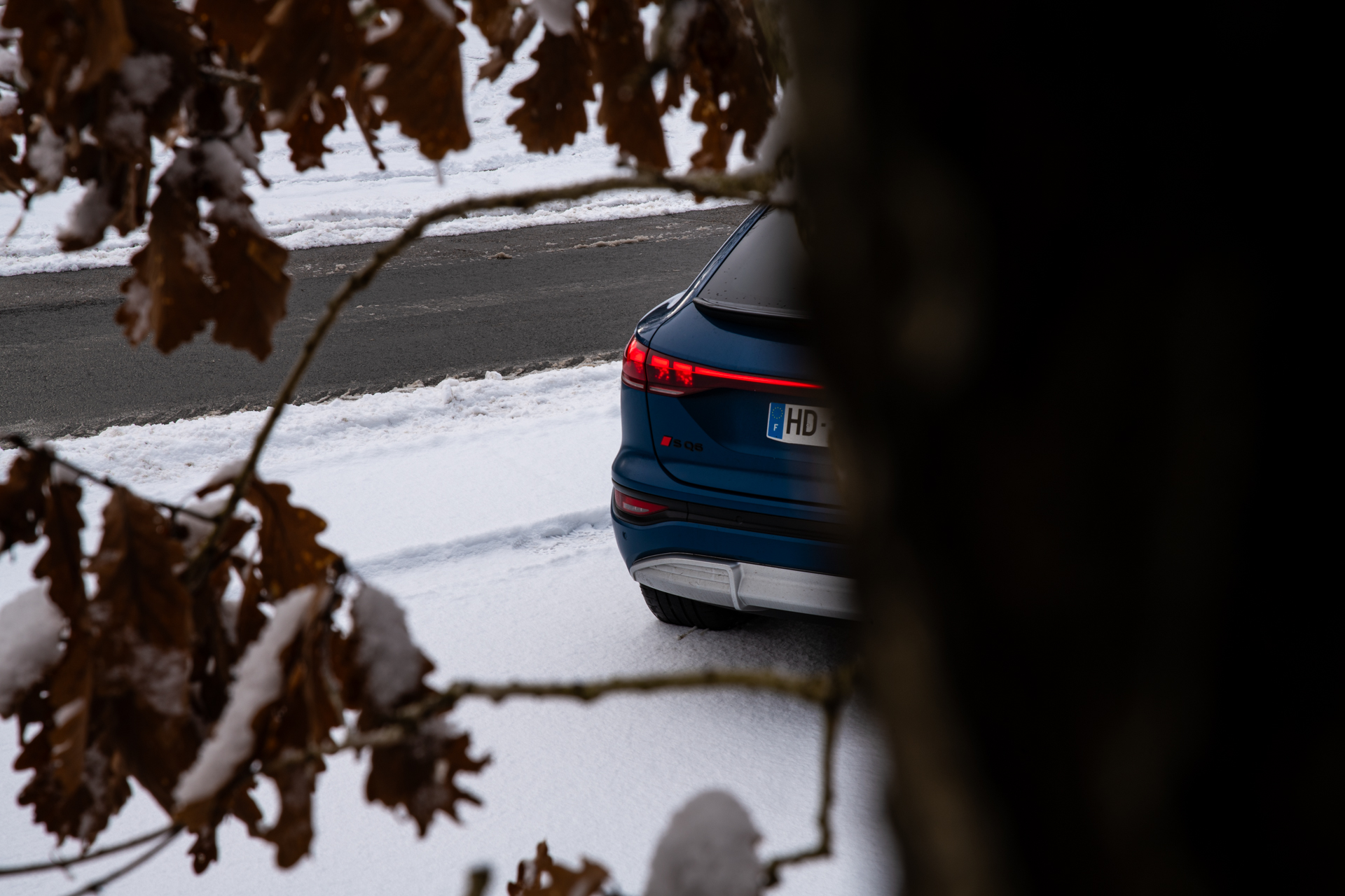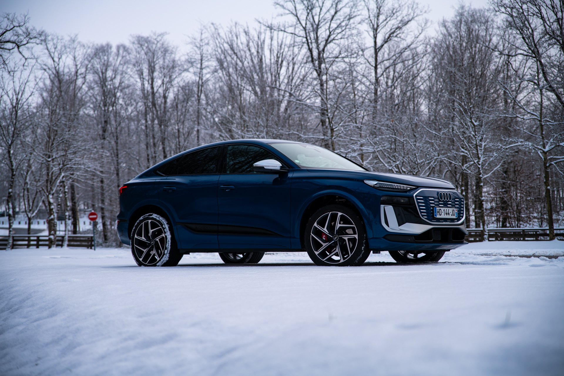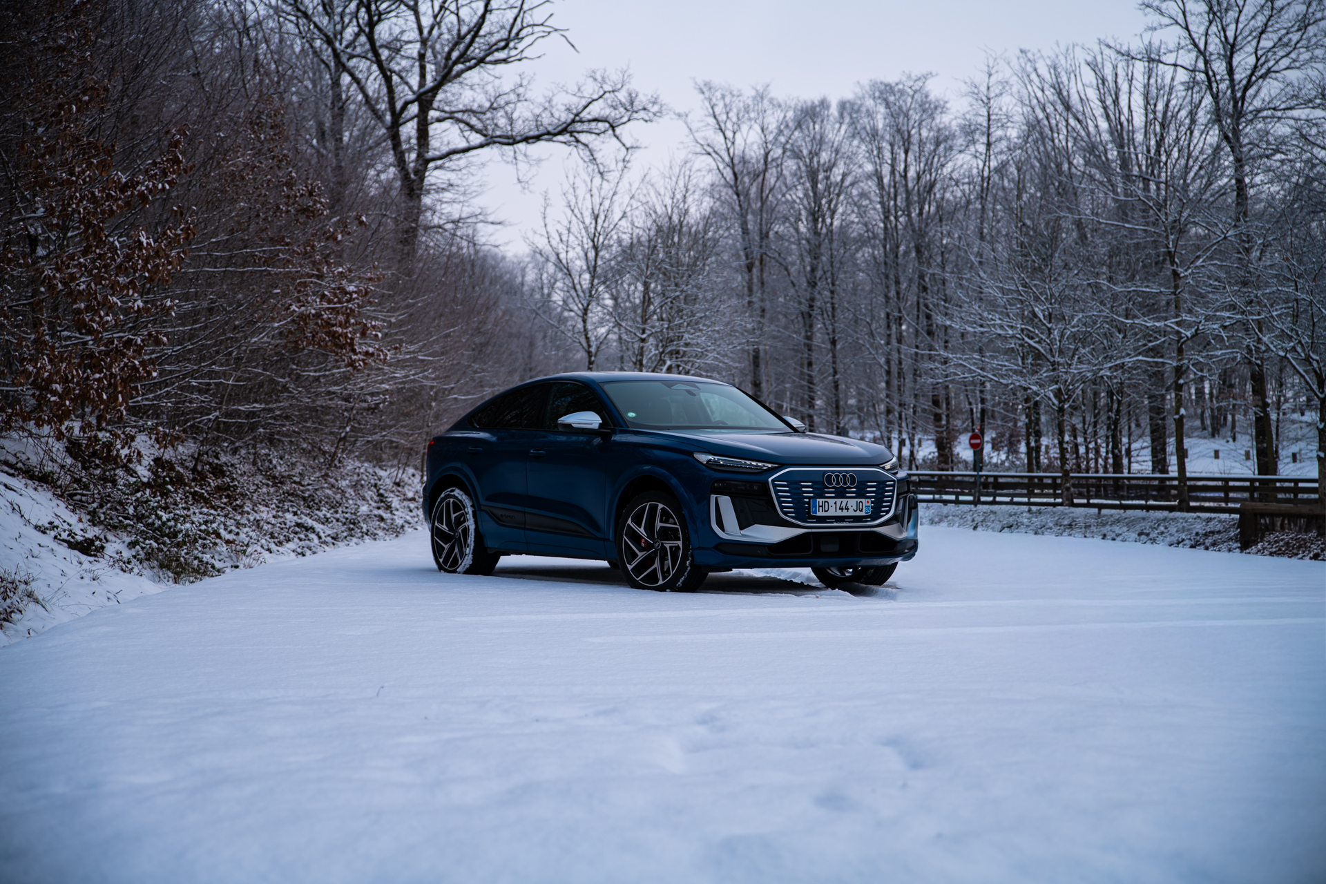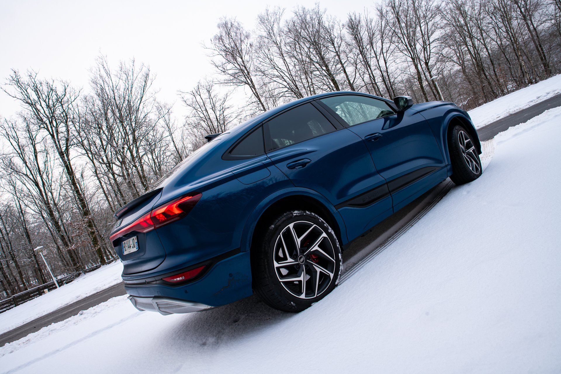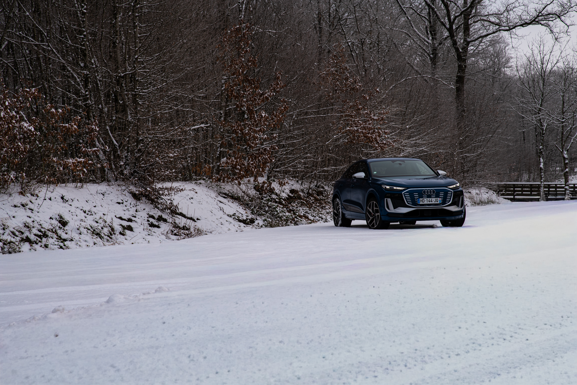 Le châssis, lui, achève de construire ce sentiment de confiance. Malgré un gabarit imposant et un poids conséquent lié à la batterie, l’Audi SQ6 e-tron Sportback se montre étonnamment agile pour un SUV électrique de ce segment. La direction, bien calibrée, offre un bon compromis entre assistance et retour d’information. Elle permet de placer précisément le train avant, même sur des routes dont l’adhérence varie d’un virage à l’autre, avec des zones plus froides, parfois encore givrées, et d’autres simplement humides.