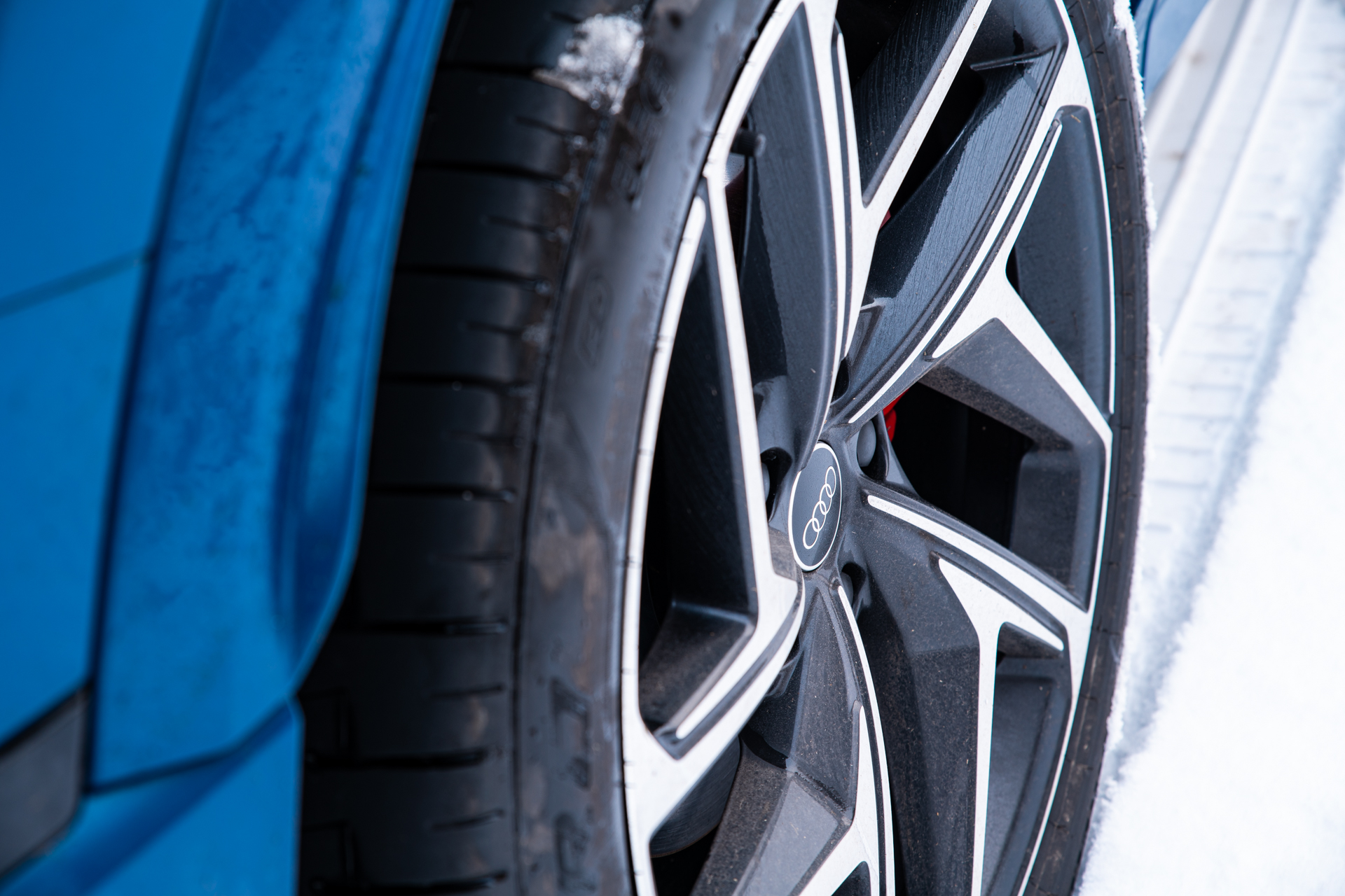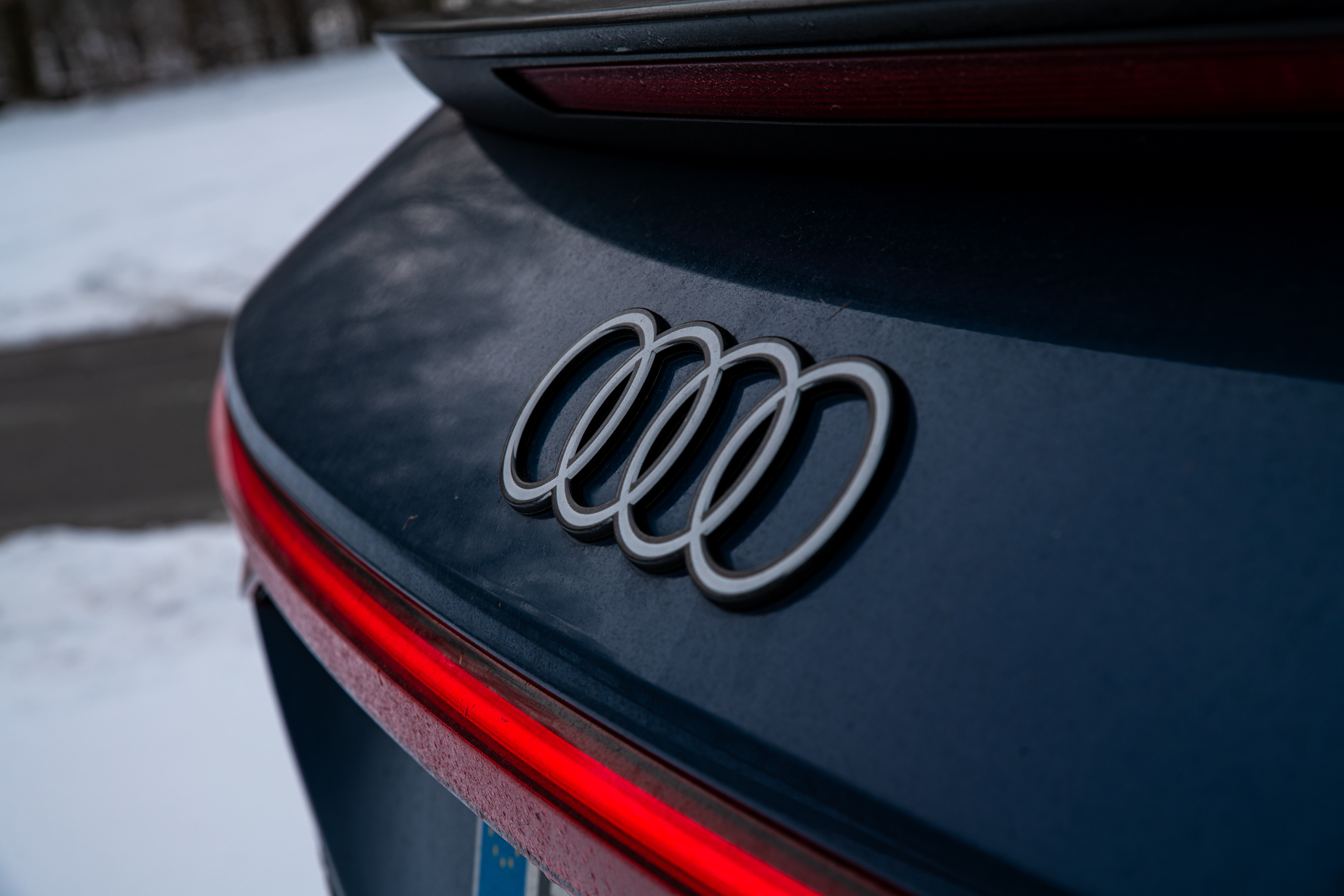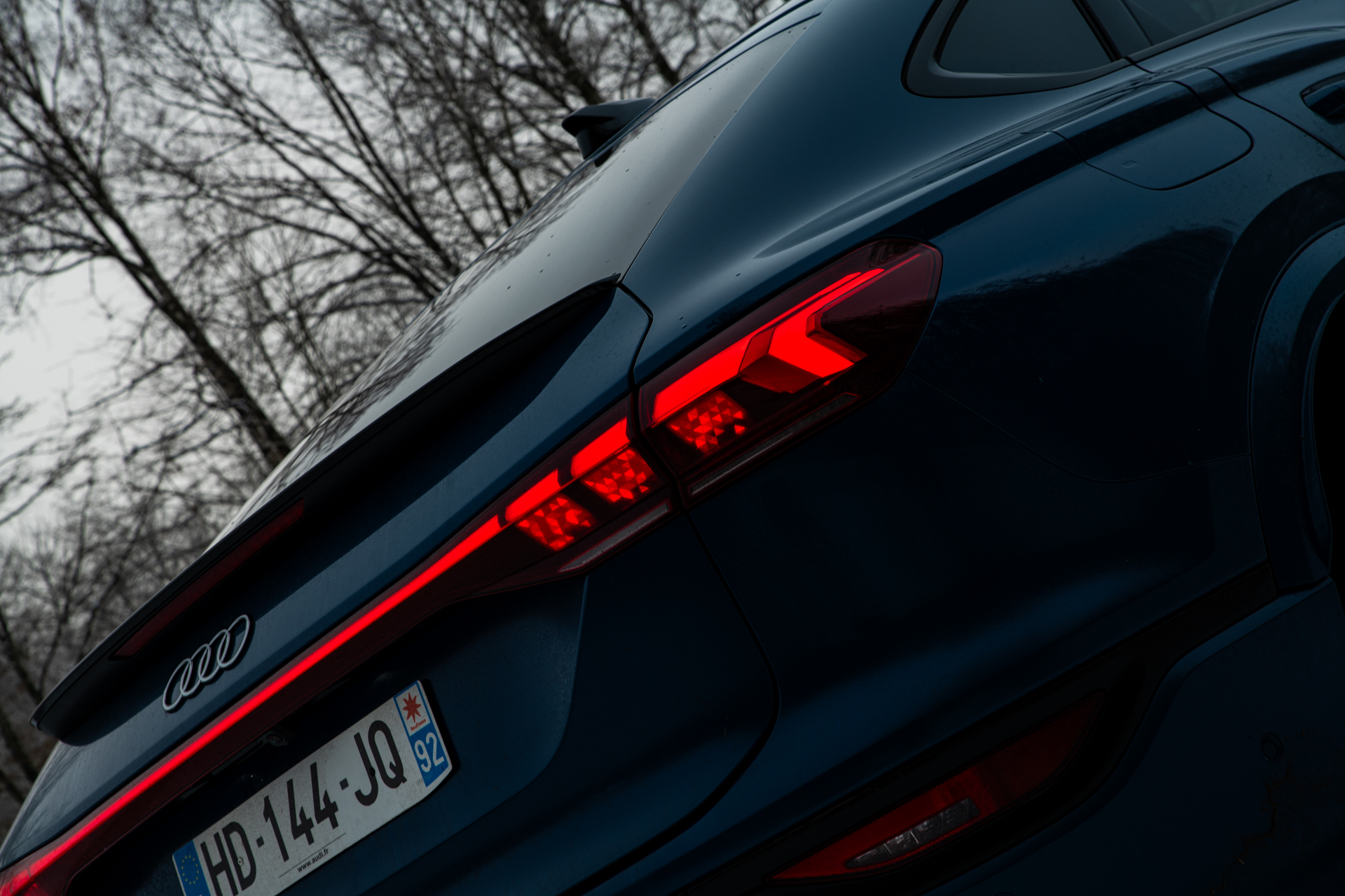 En latéral, le profil Sportback fait tout le travail. Les jantes généreusement dimensionnées remplissent parfaitement les passages de roue, tandis que les bas de caisse sculptés accentuent visuellement la longueur du véhicule et sa posture ancrée au sol. Le traitement des surfaces reste fidèle à la grammaire Audi : tendu, précis, sans esbroufe inutile. La ligne de vitrage remonte légèrement vers l’arrière, donnant une impression de mouvement même à l’arrêt, comme si la voiture était prête à bondir au moindre appui sur la pédale de droite.